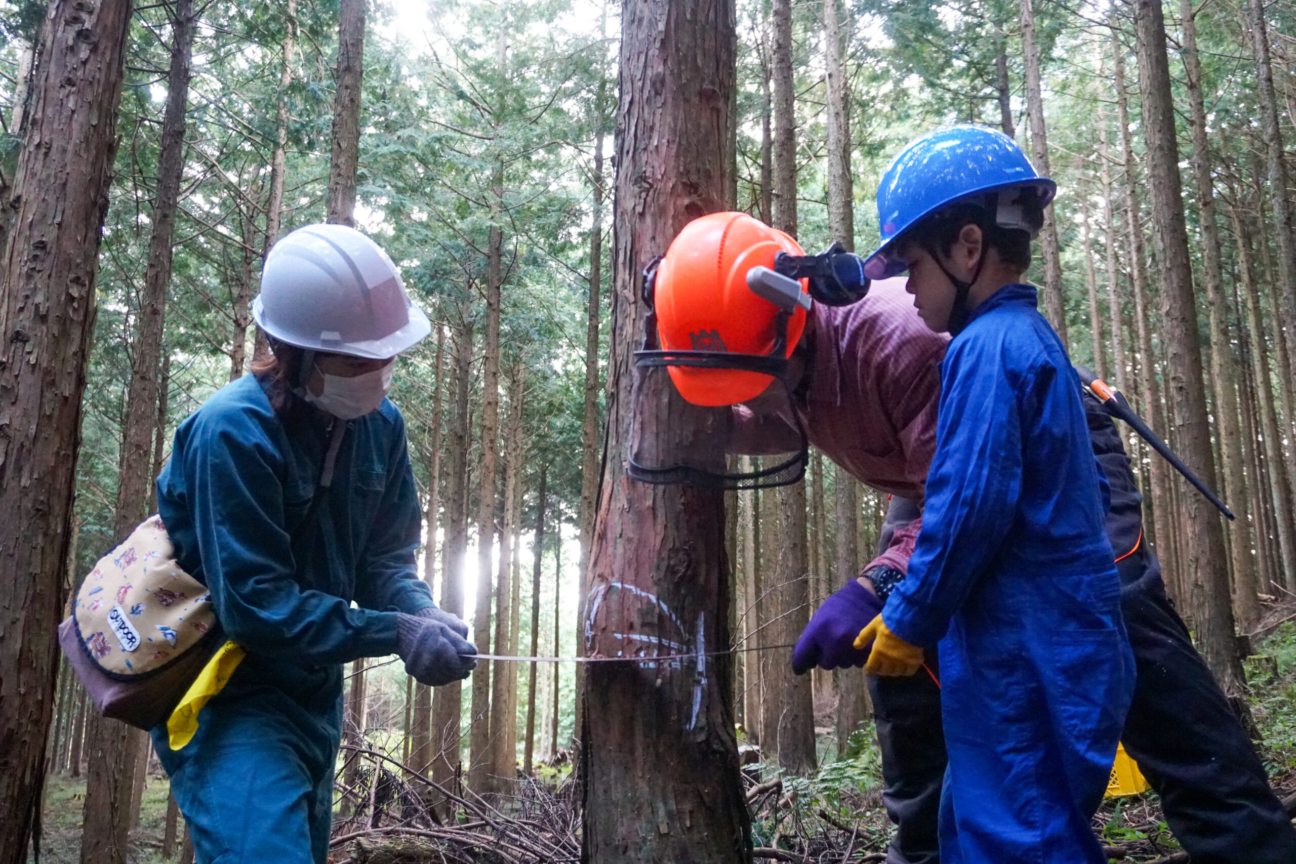 森をよーく見てみて、倒れる方向を考えながらノコギリを入れていきます。