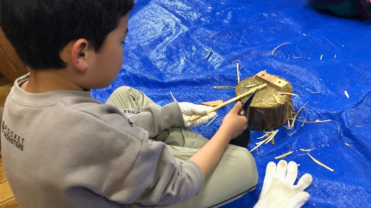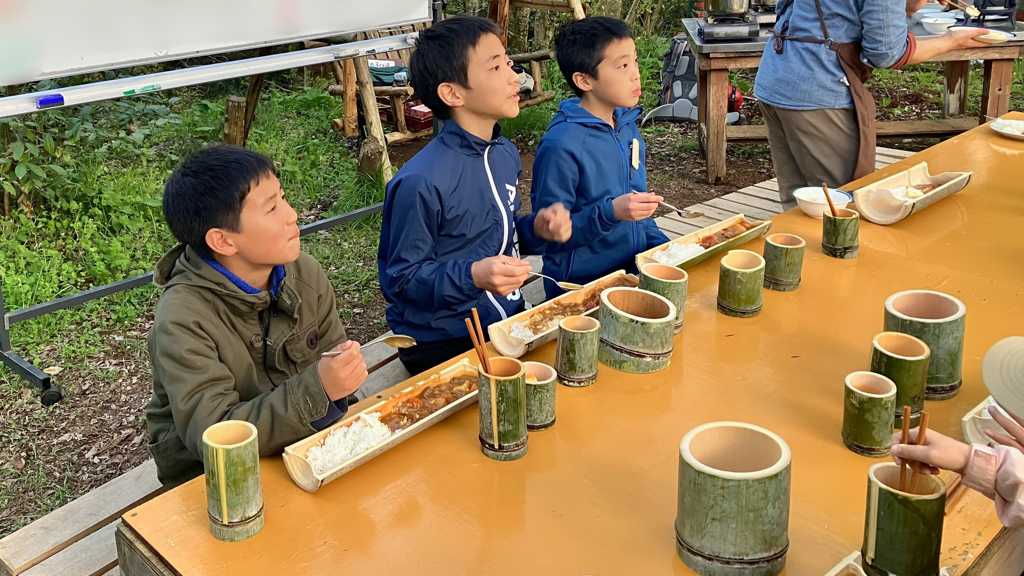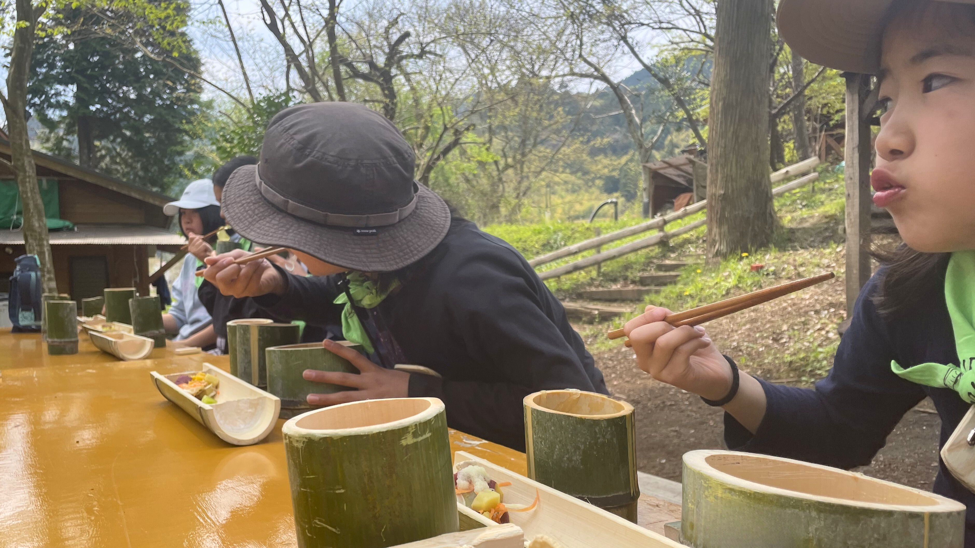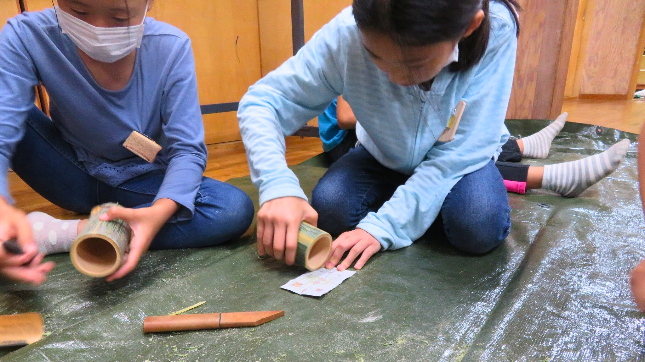 ものづくりキャンプでは、竹やお茶など里山の恵みを使い、自分たちの手でさまざまなものを作りあげます。