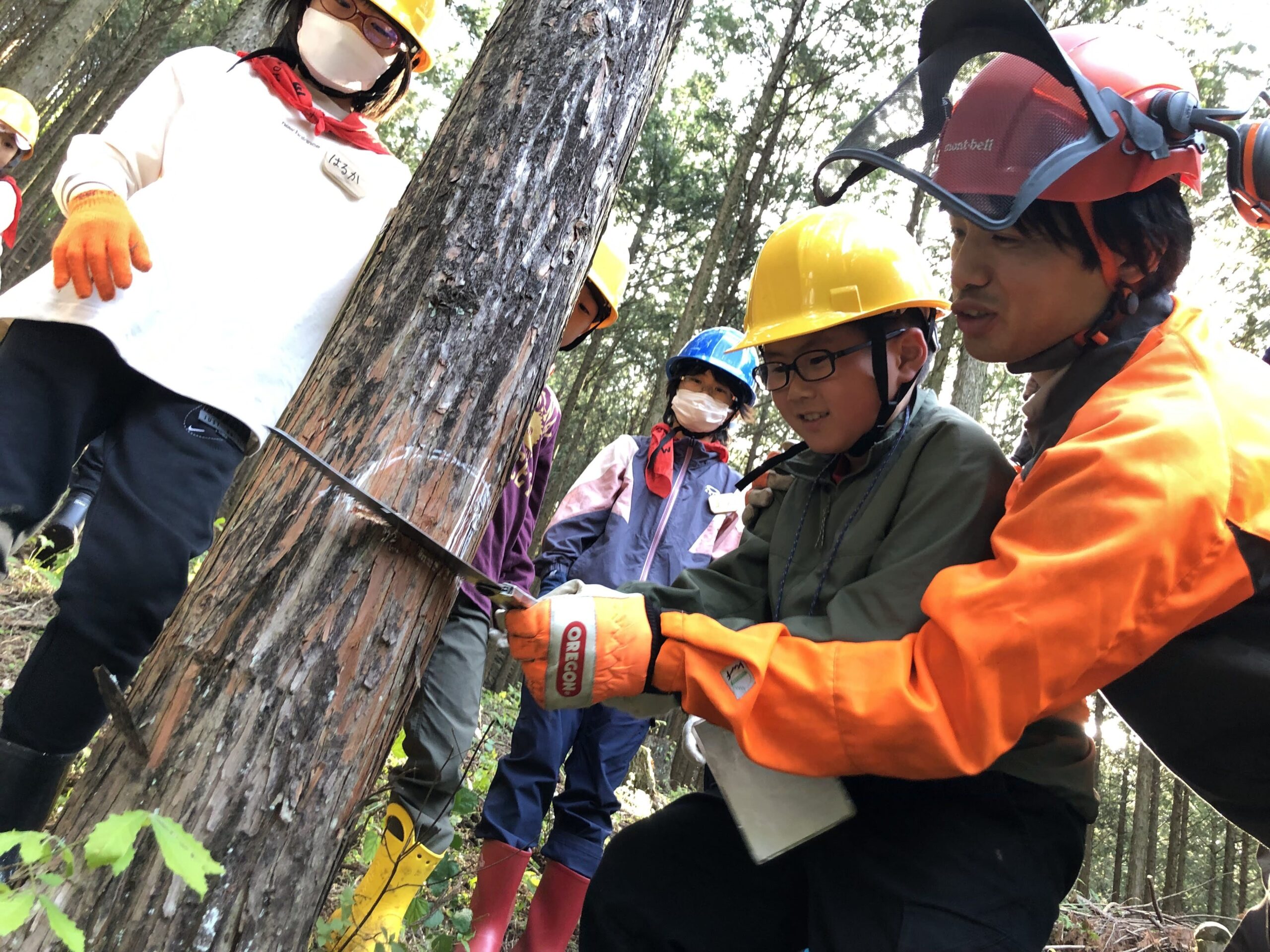 力を合わせて1本の木を伐り倒す。木々の命と魅力を味わおう。