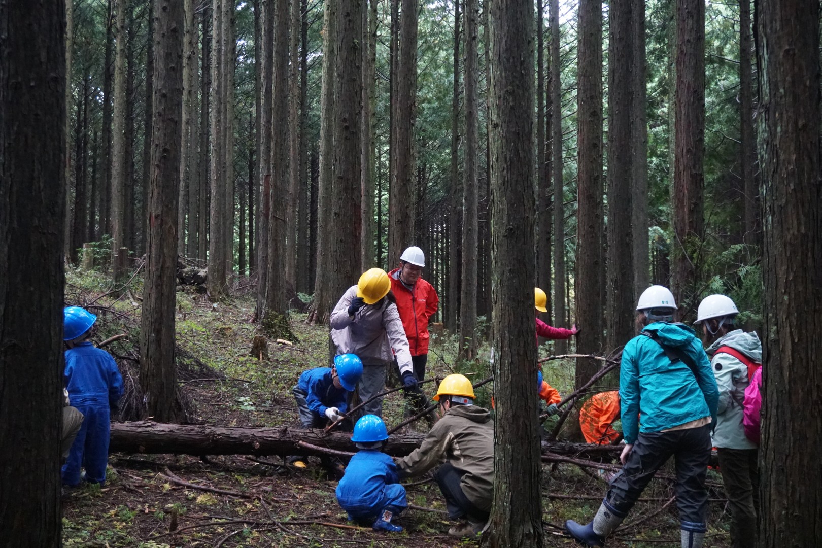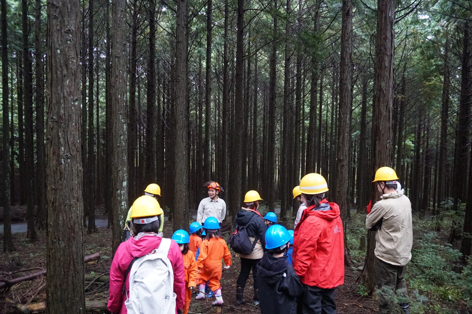 ホールアースから車を走らせること約30分。ホールアースが管理している人工林にやってきました。スギやヒノキが立ち並ぶ林。子どもたちはつなぎを着て、準備万端です!