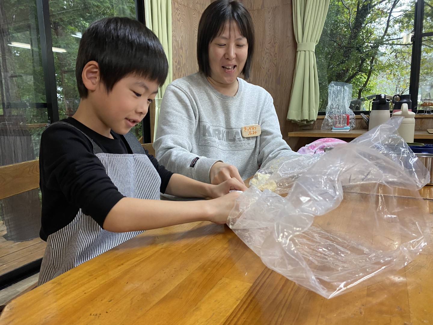 生地の材料を袋に入れてこねこね!手が汚れずに作れちゃいます。
