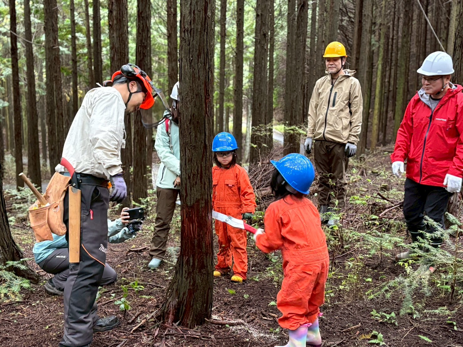 まずは、スタッフがチェーンソーで木を伐る様子を見学してもらいました。森の中にチェーンソーの音が響き渡ります。