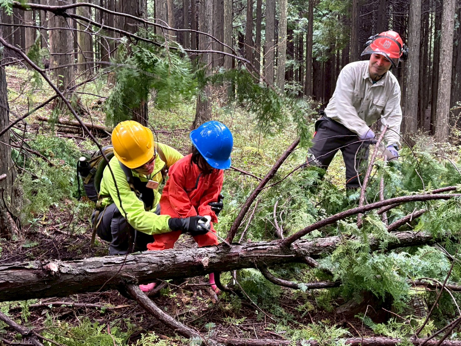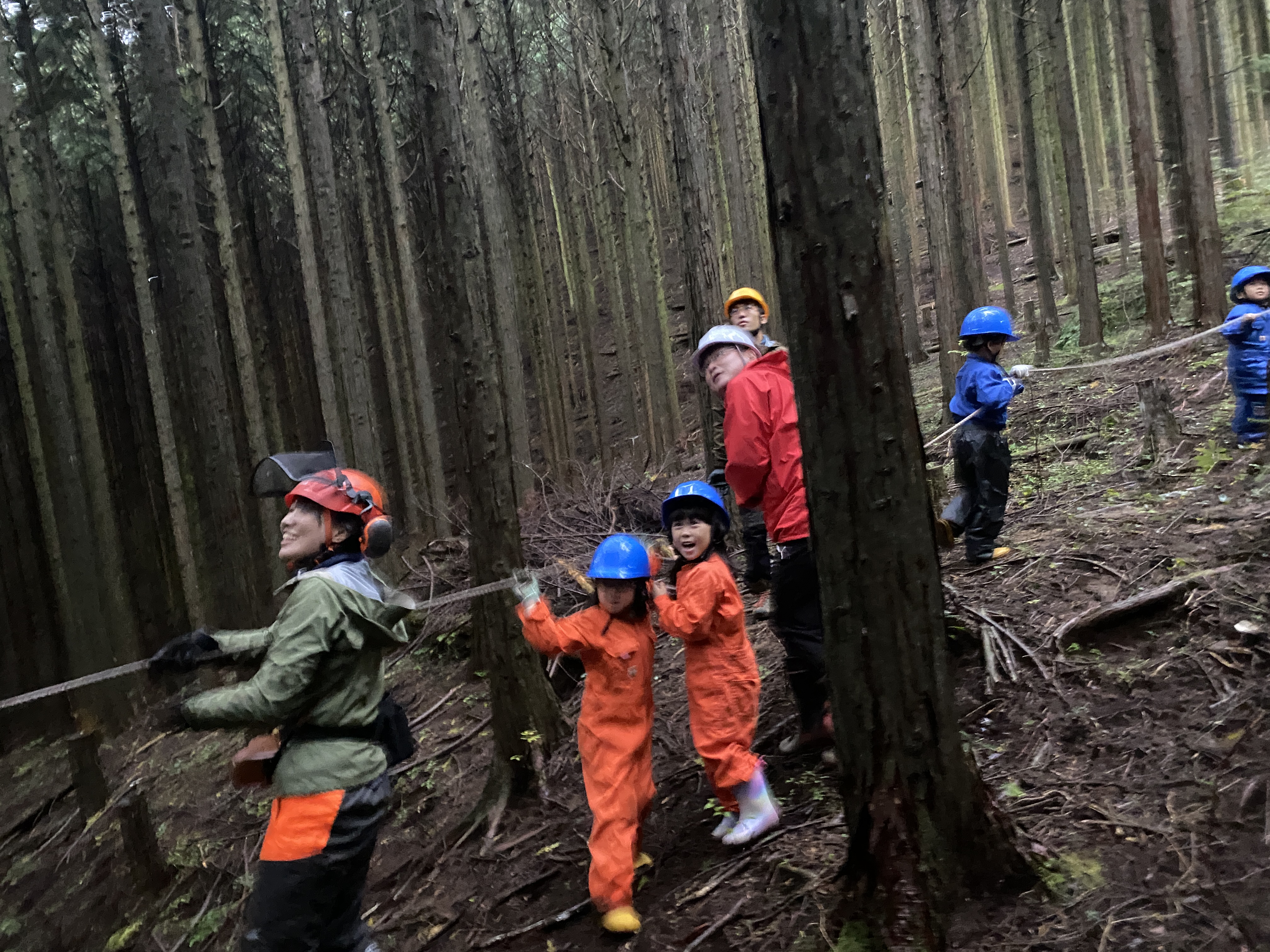 みんなで協力して、1本の木を倒すことで、生きている木の香りや重み、瑞々しさを感じてもらいます。
