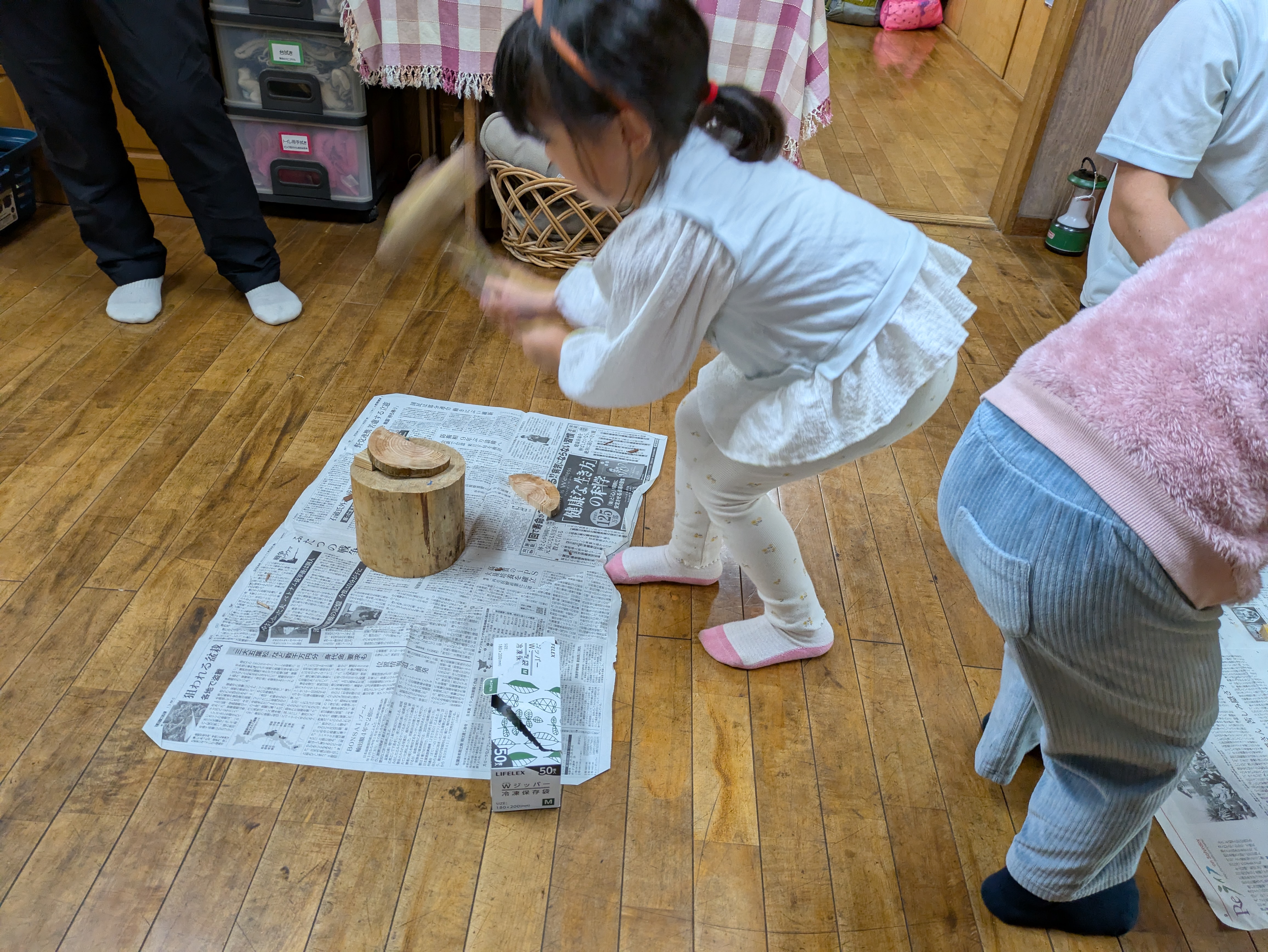 輪切りに好きな絵を描いて、木づちで思いっきり叩き割ります!どんなピースになるのかは、割ってからのお楽しみ♪