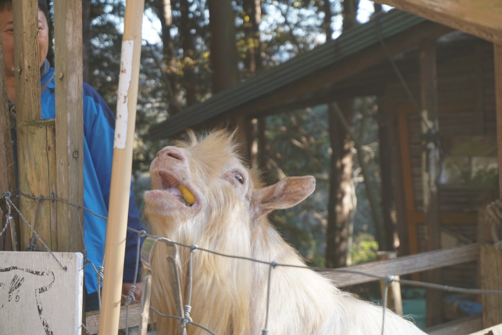 ヤギのチャイくんにあいさつして、みかんの皮をおすそ分けしたり、