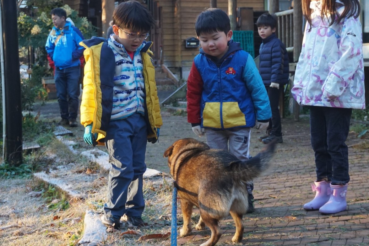 2日目、朝は動物のお世話から始まります。お散歩が大好きなサトは、みんなが来ると大喜び!
