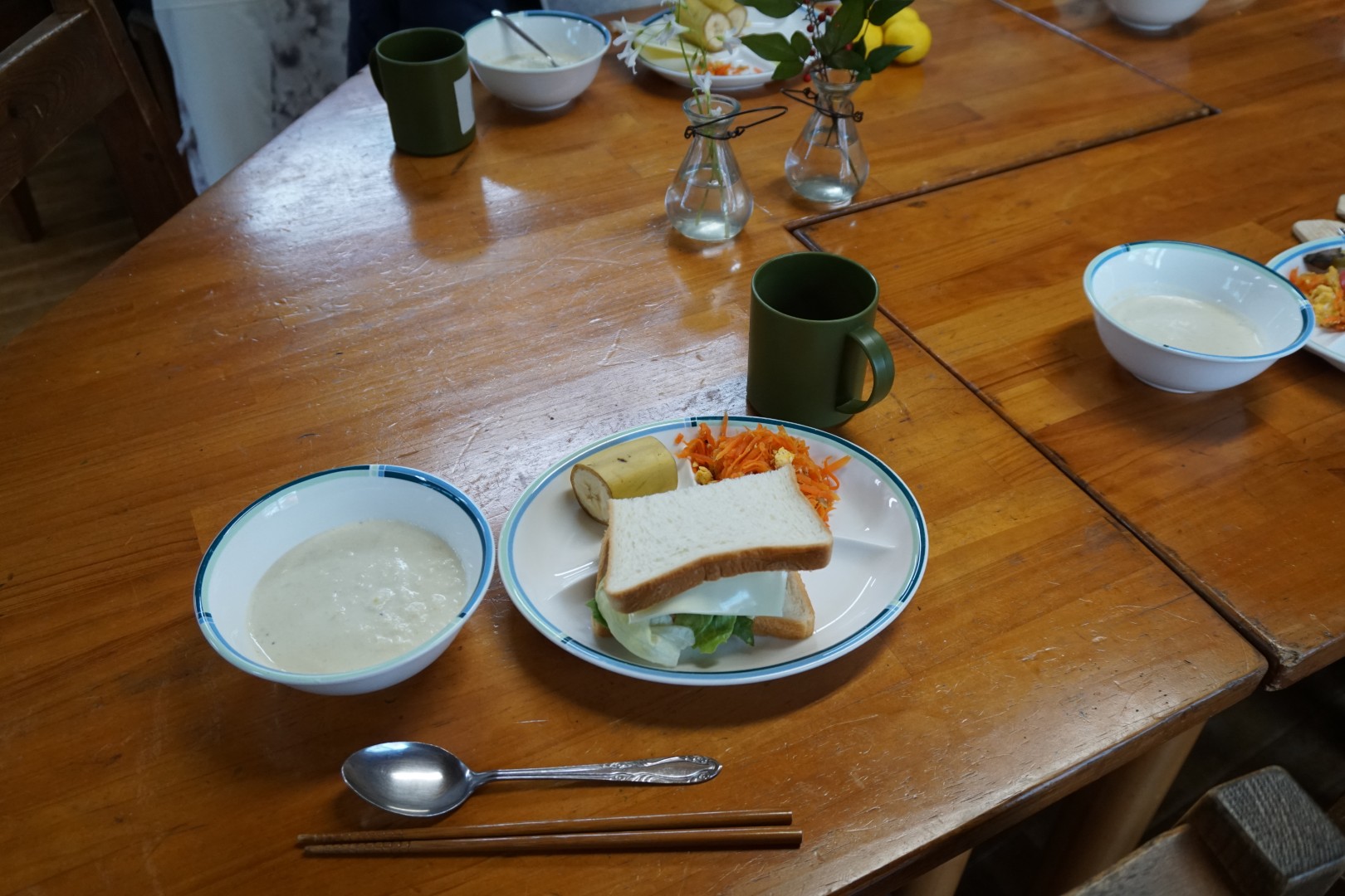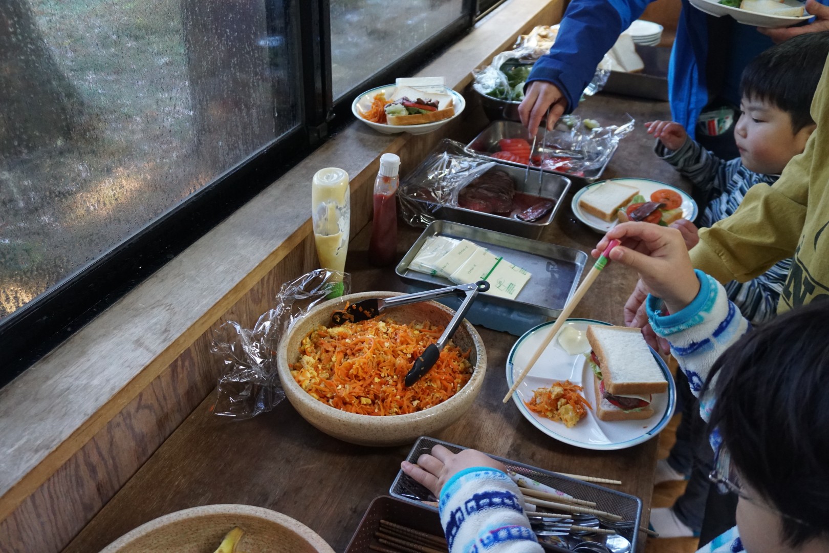 動物たちにごはんをあげた後は、自分たちの朝ごはんです。