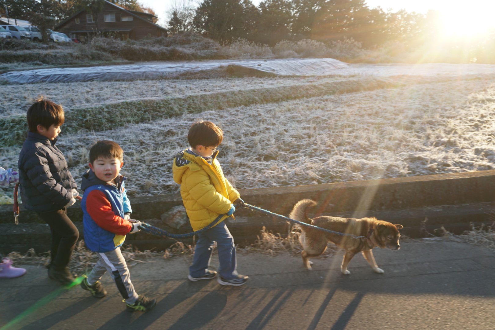 朝日に照らされながら、霜が降りた里山を歩きます。