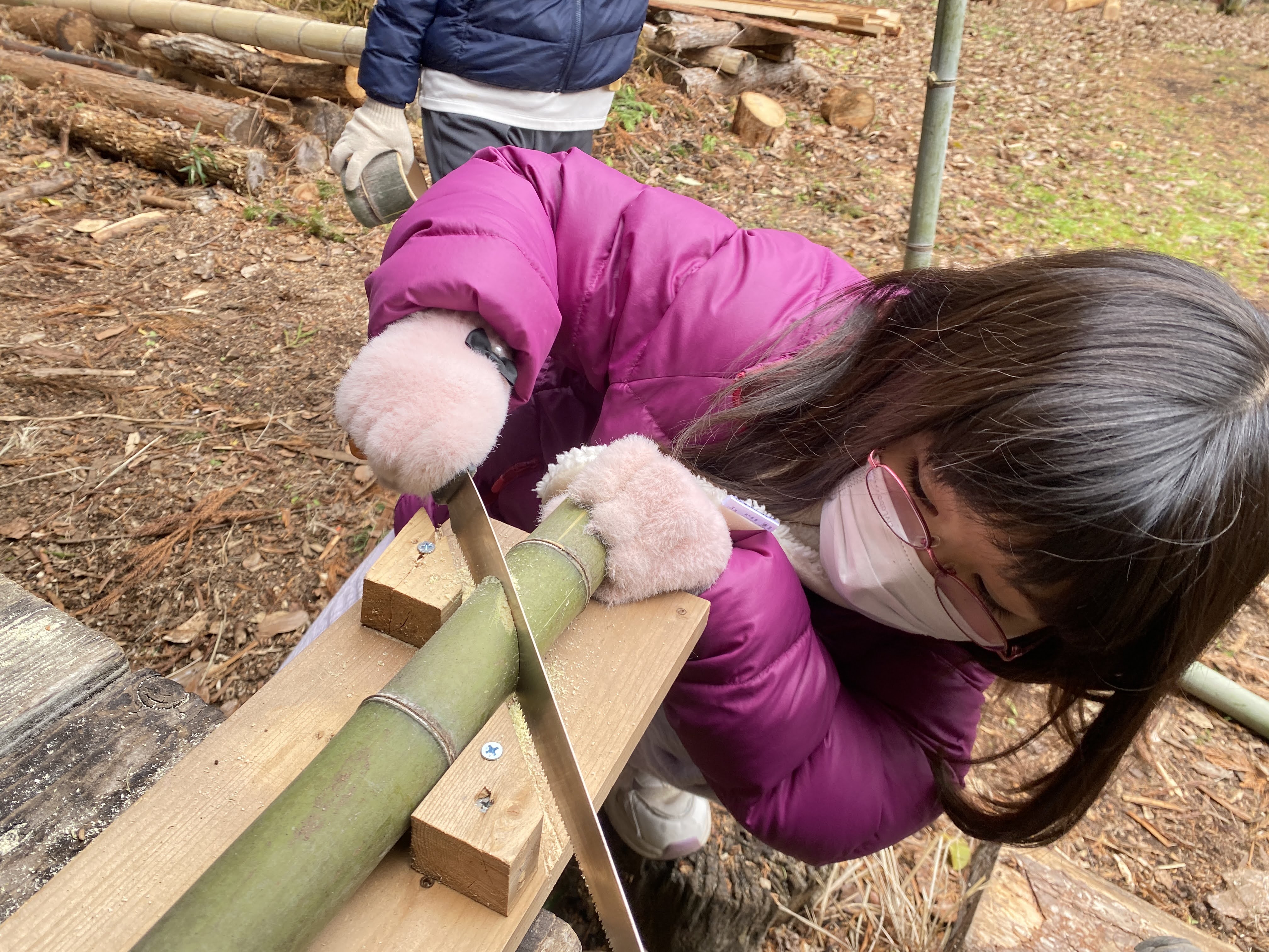 ノコギリを使って、竹を斜めに切るところから始めました。