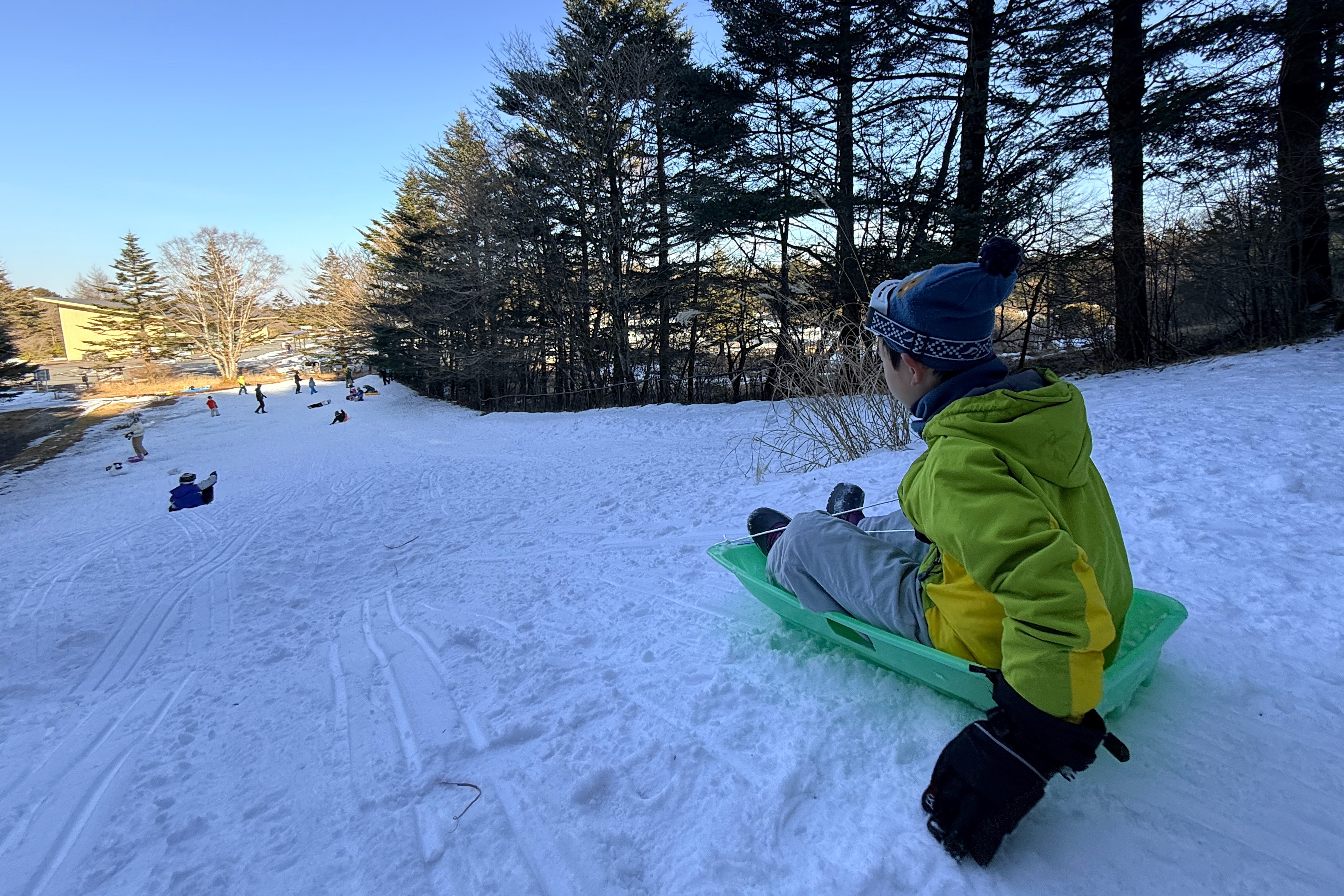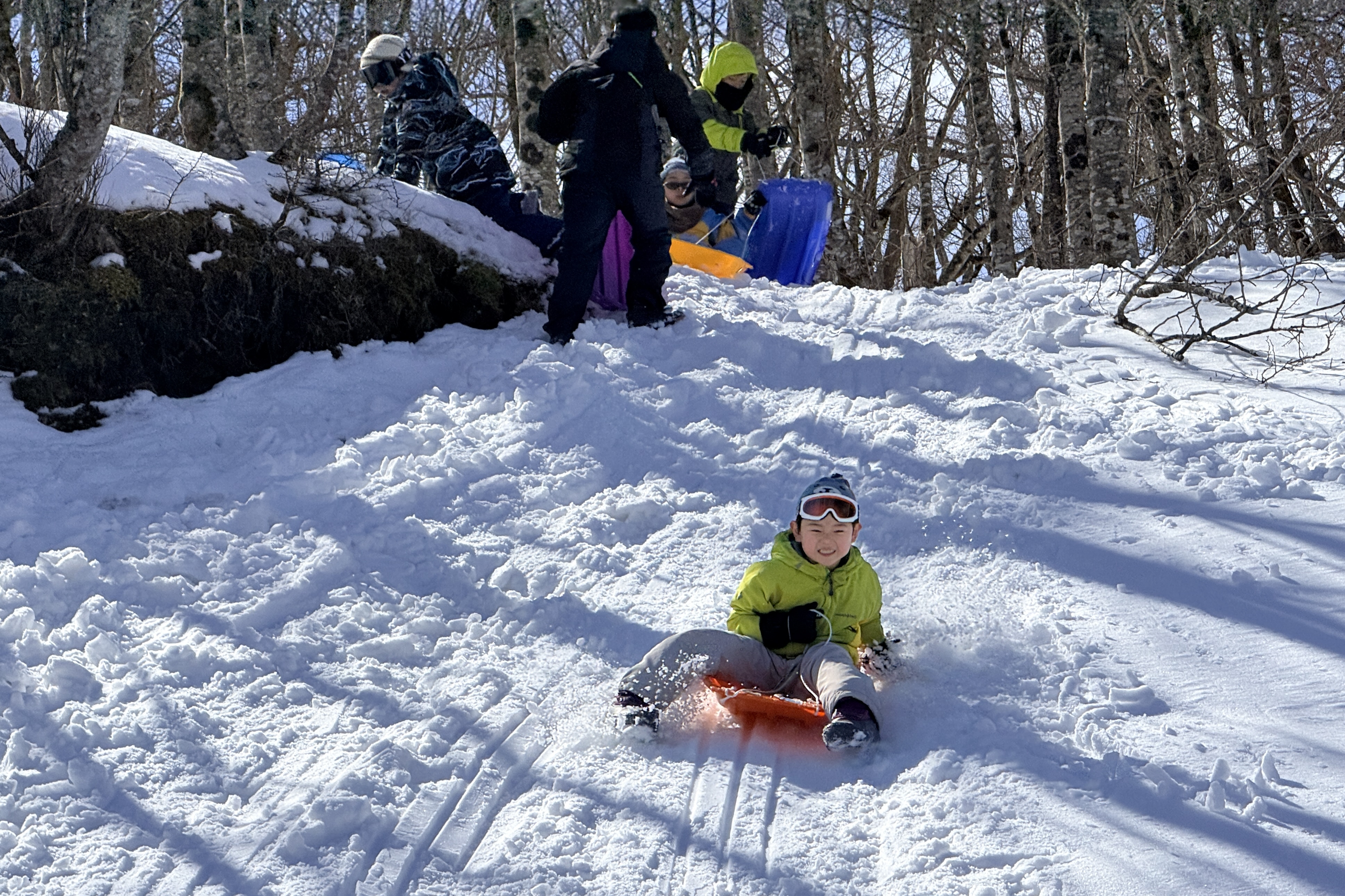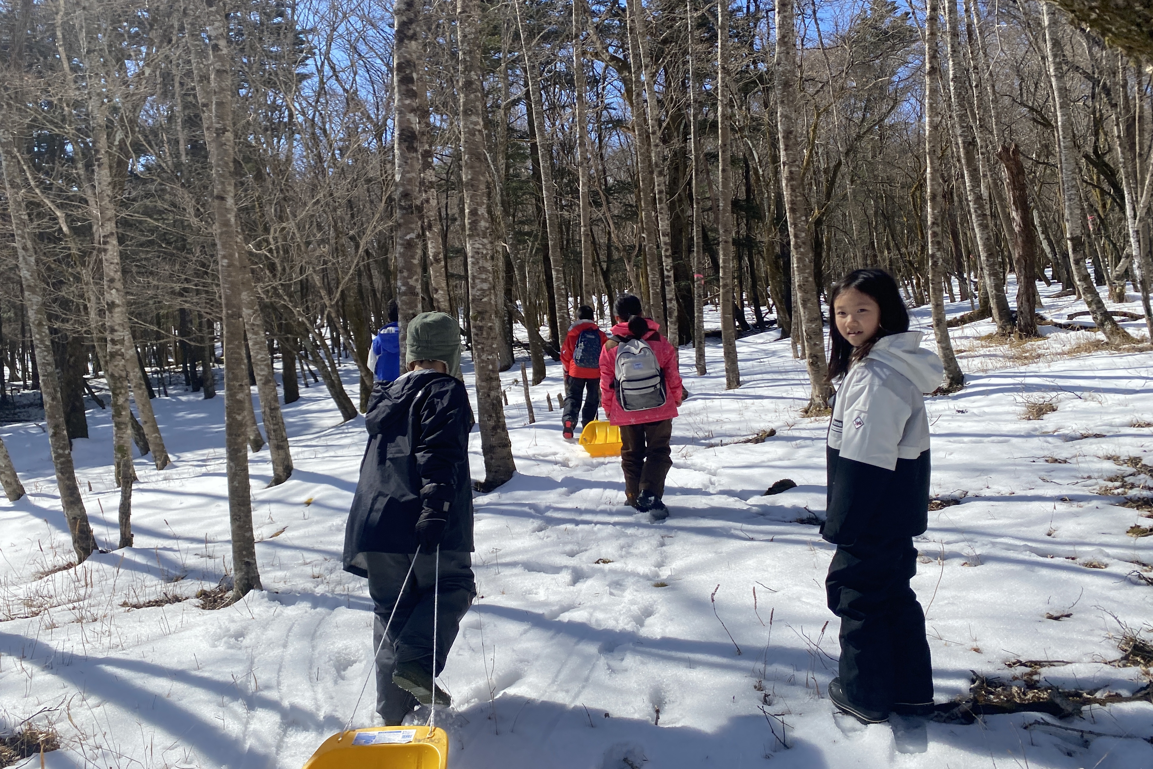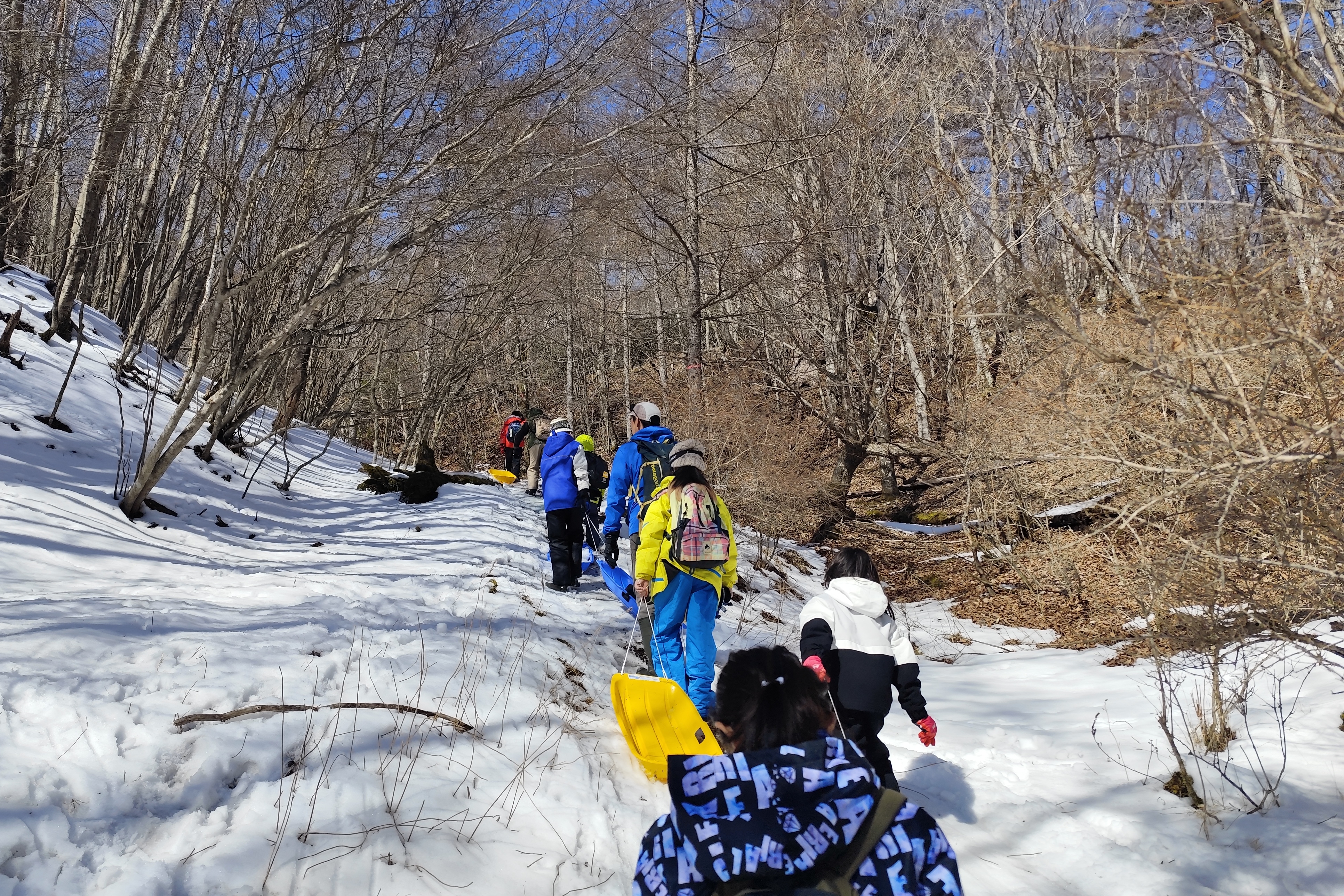 下山時は雪のある場所を狙ってソリで滑り降りる子もいました。