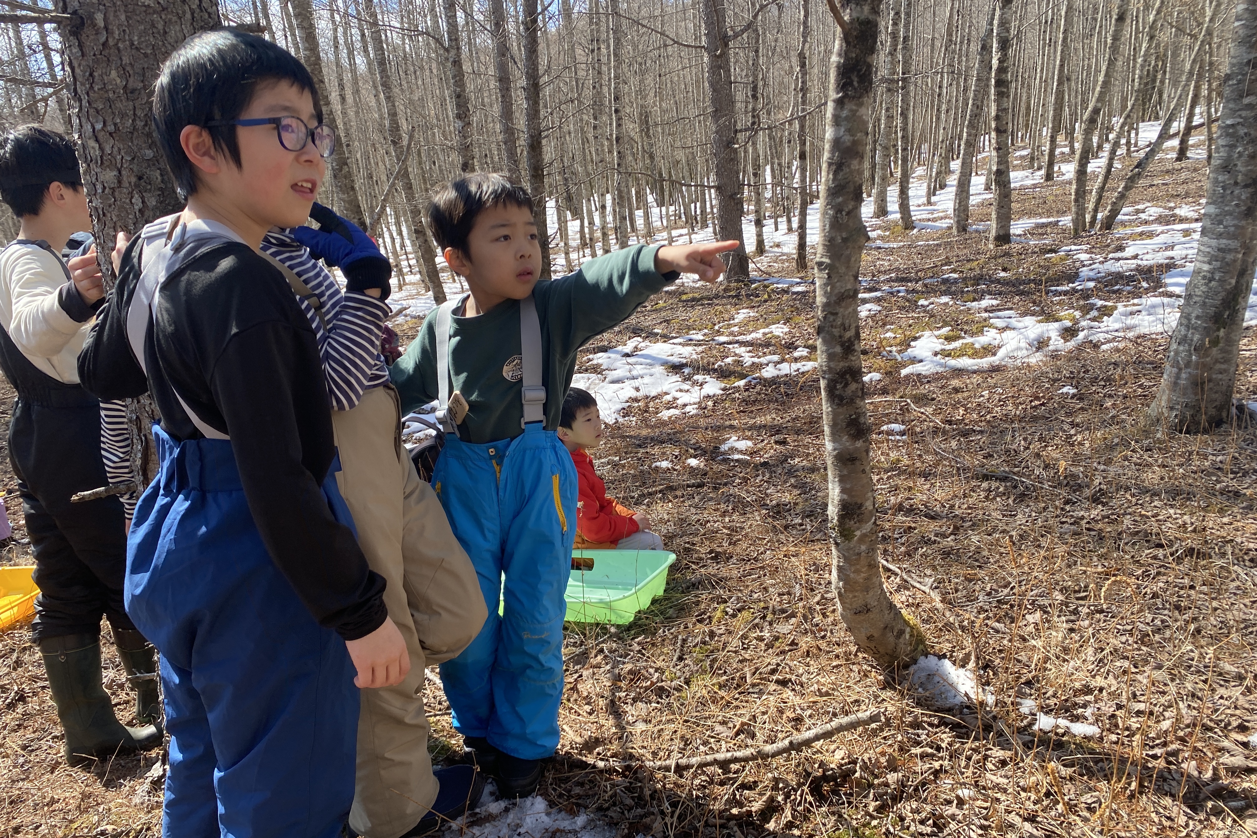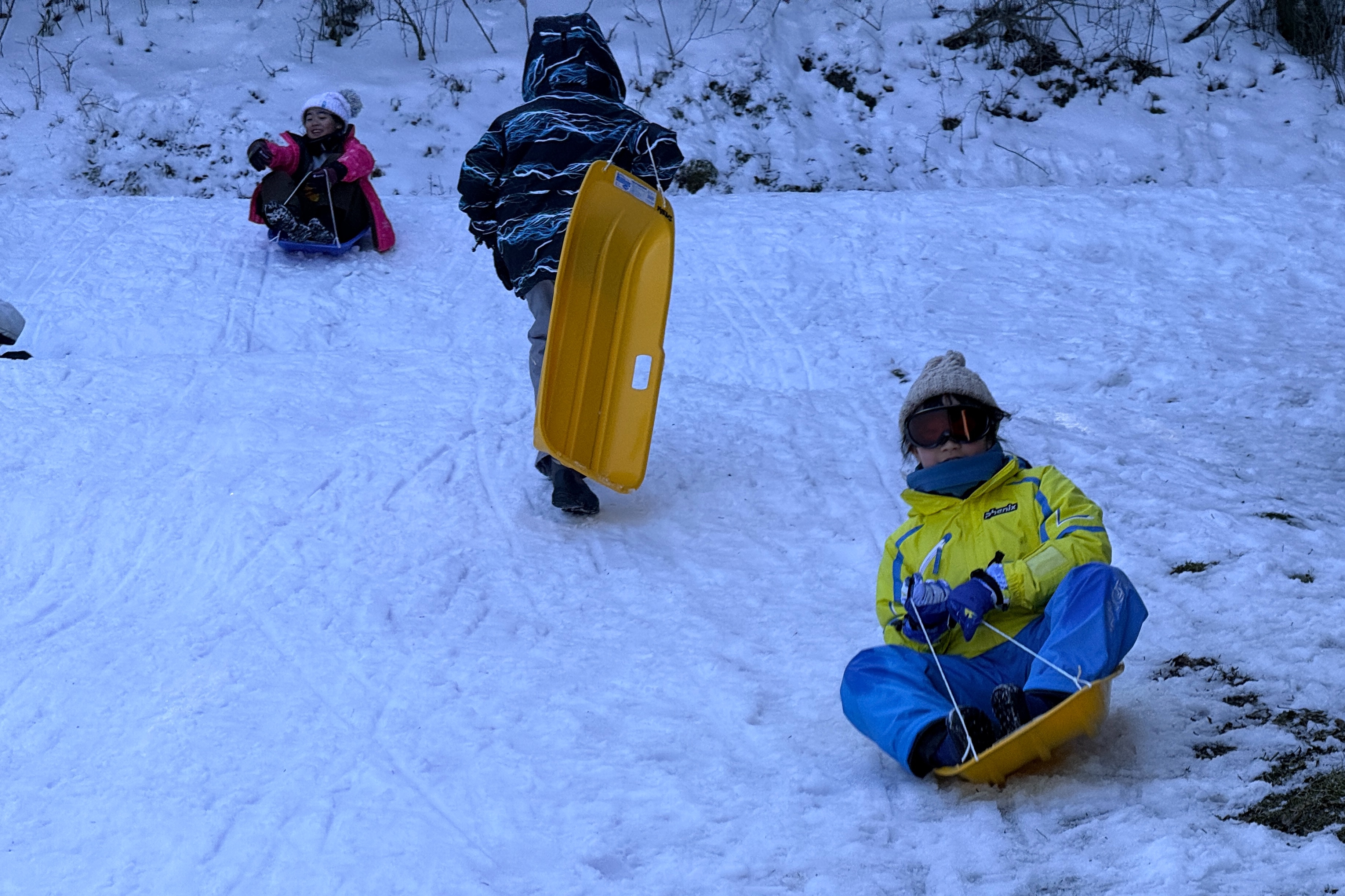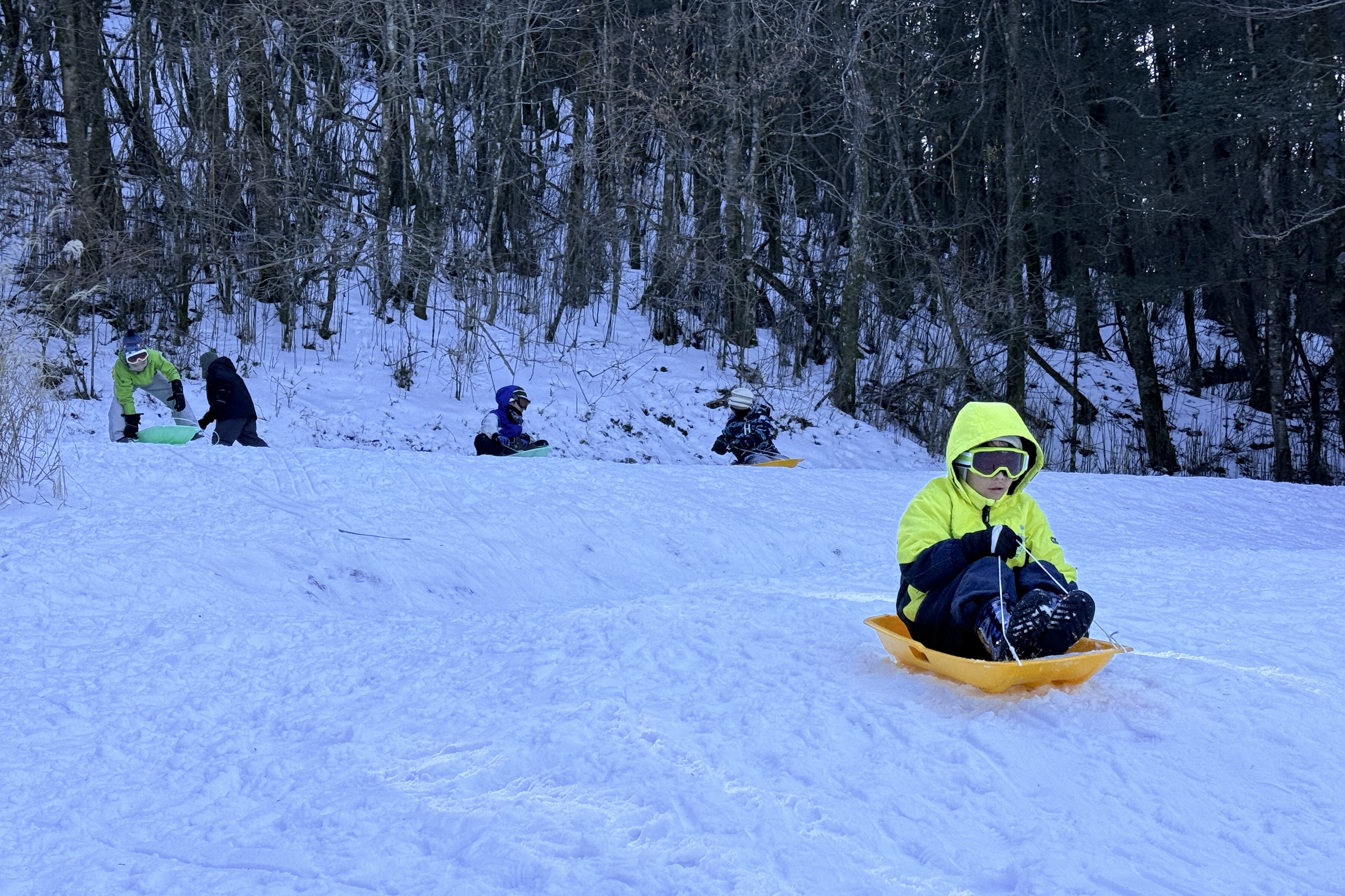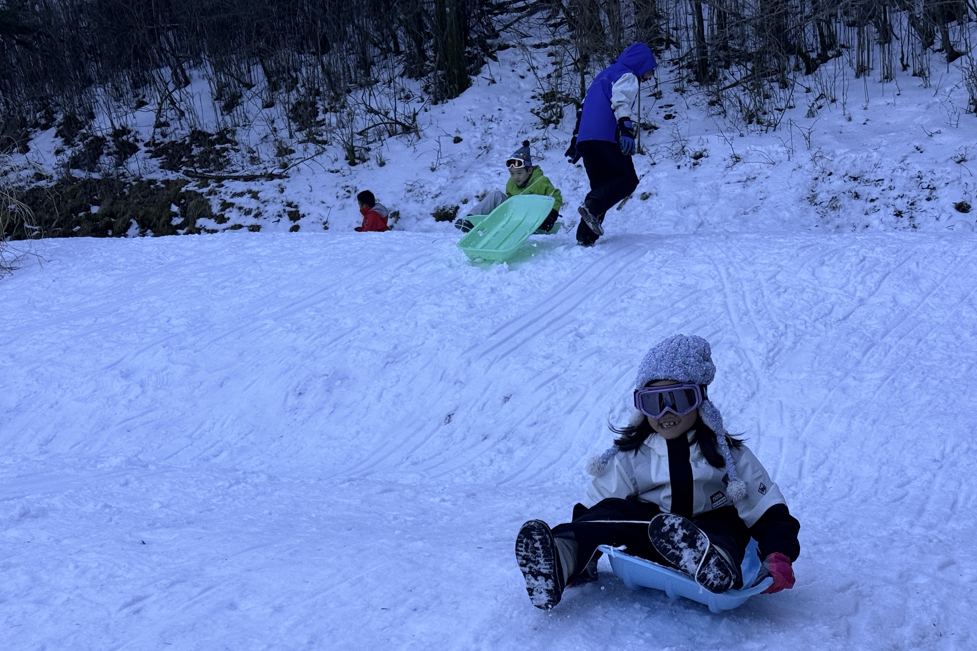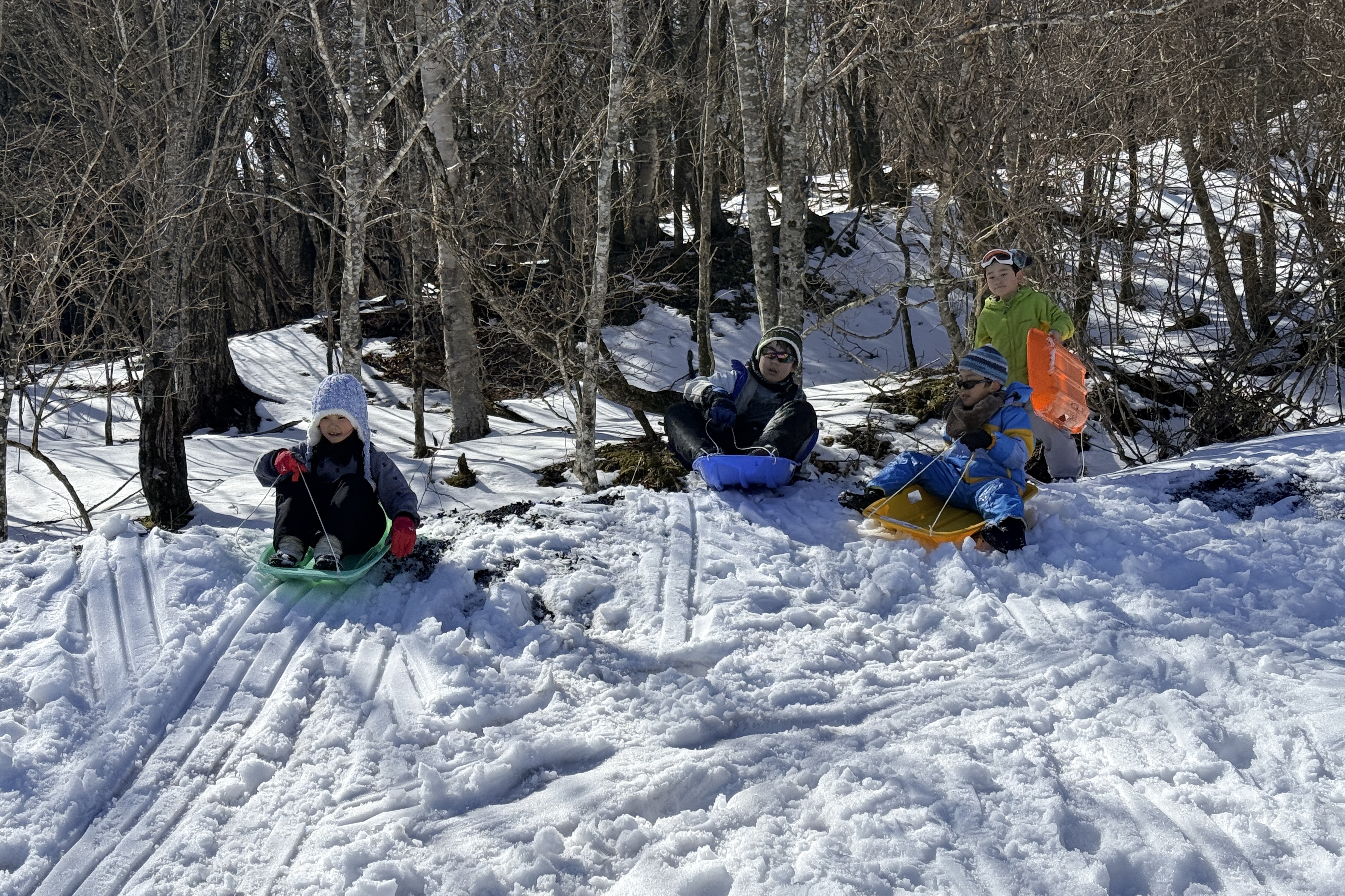 下山時は雪のある場所を狙ってソリで滑り降りる子もいました。