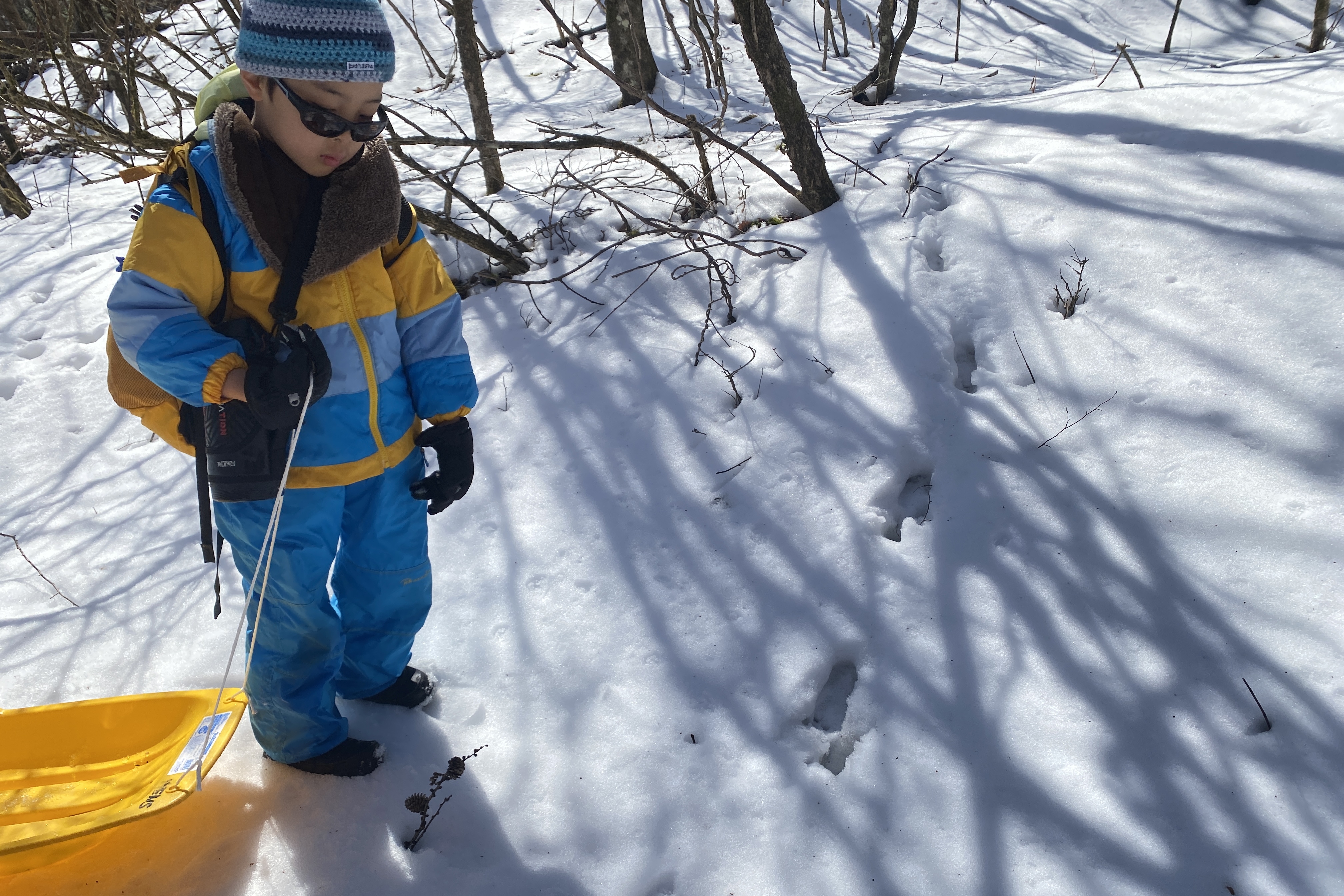 雪道を一歩ずつ踏みしめて登るのは楽ではありませんが、途中で動物の足跡を見つけたり、林の中でゲームをしたりと、発見の連続。