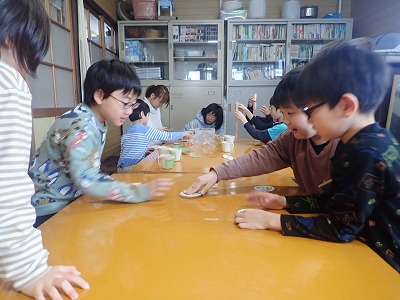 はじめてお餅を搗く子もいたりして、みんなで「よいしょ、よいしょ!」の掛け声で、美味しいお餅を搗くことが出来ました!