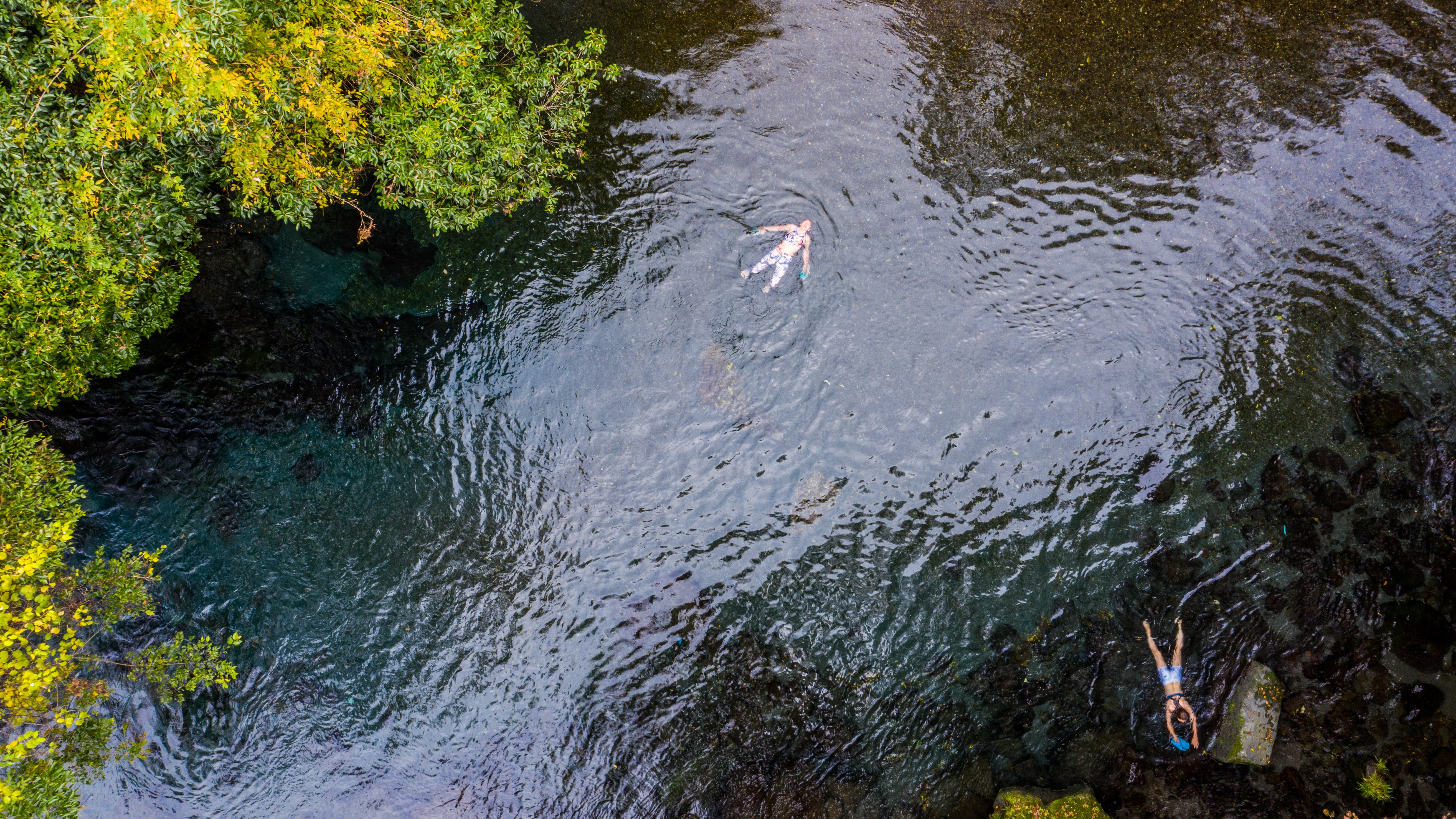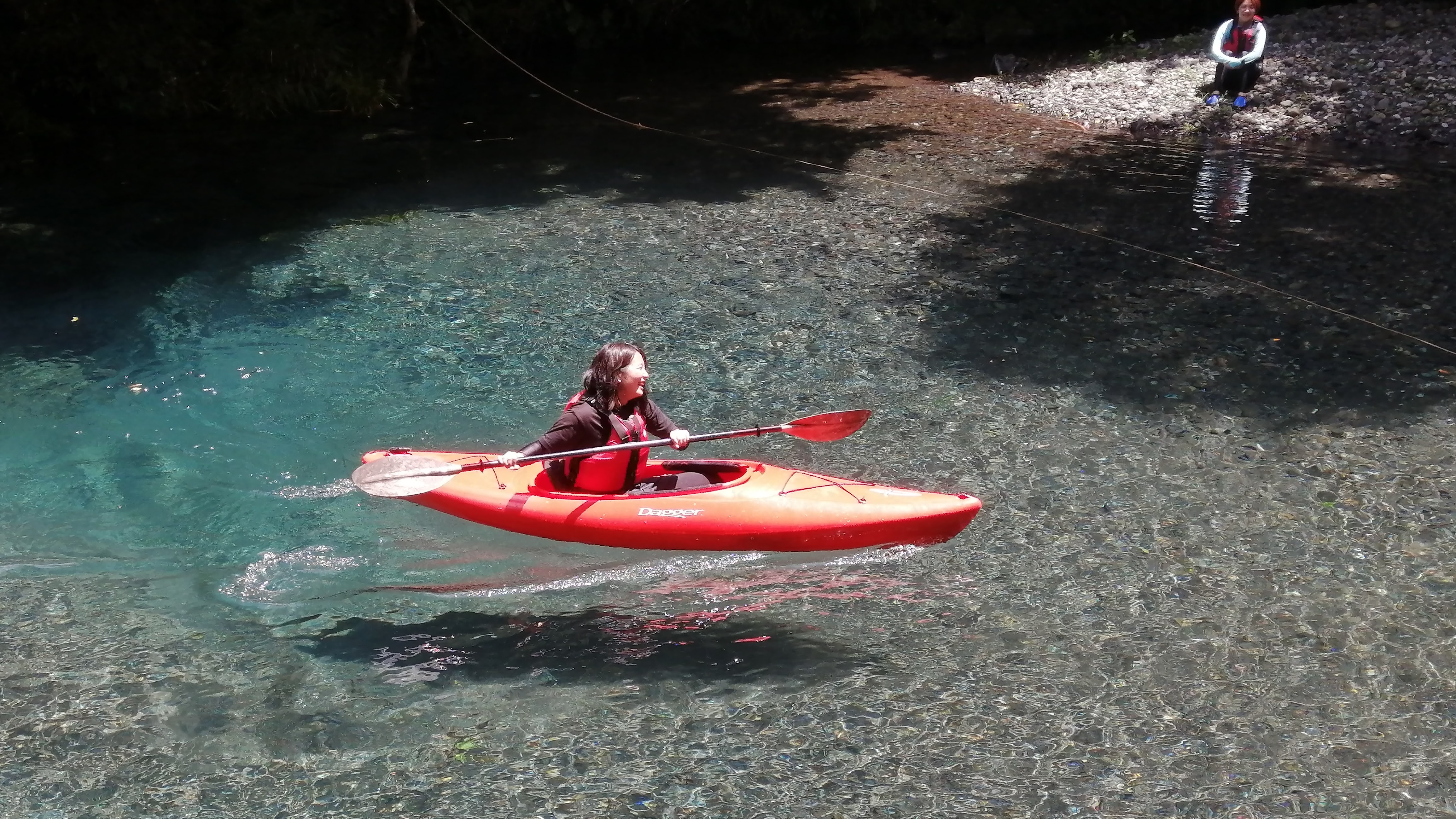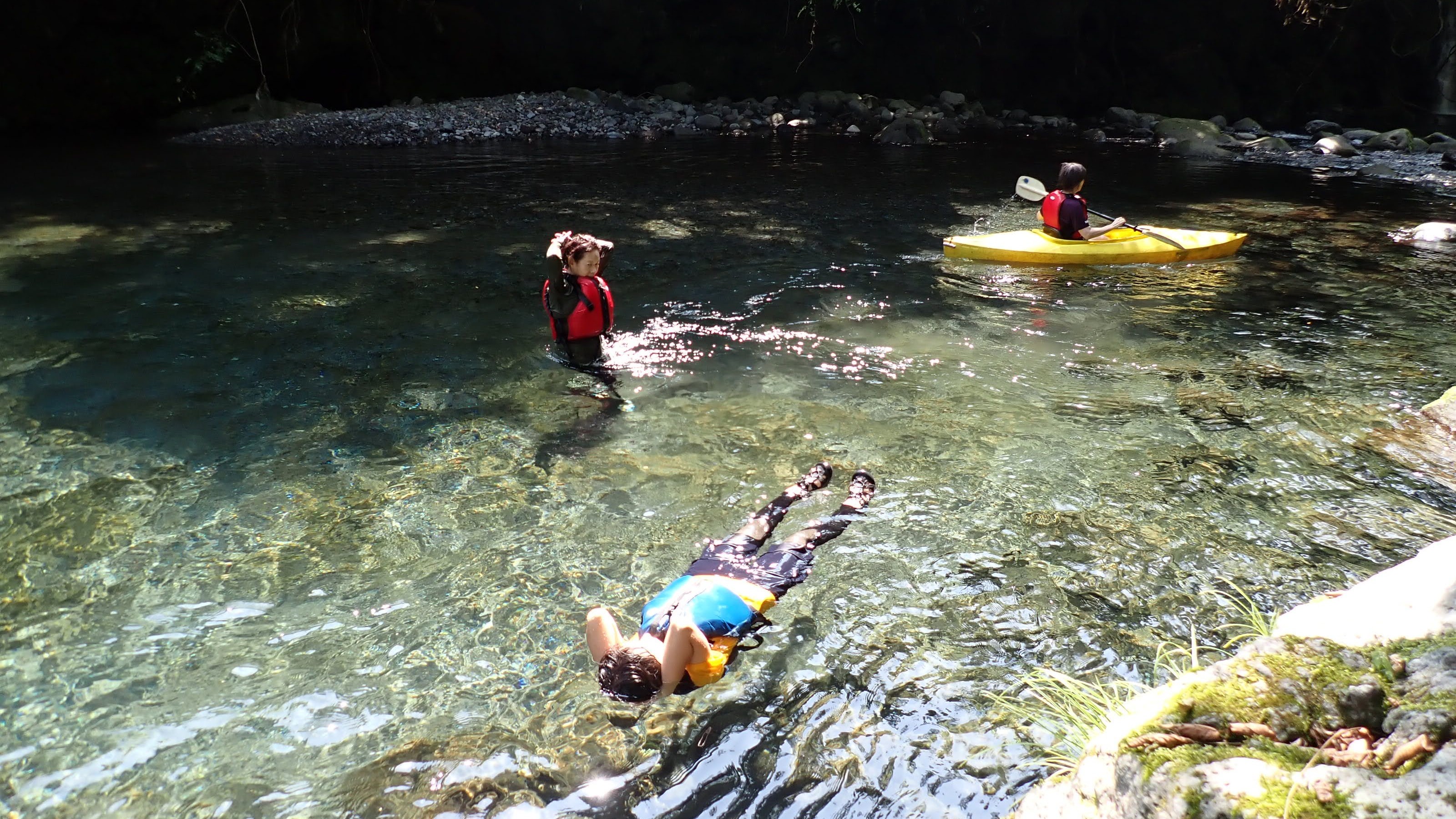 その川で水遊び。岩から飛びこんだり、浮き輪で流れたり、トロ場でカヌーにも挑戦します。
